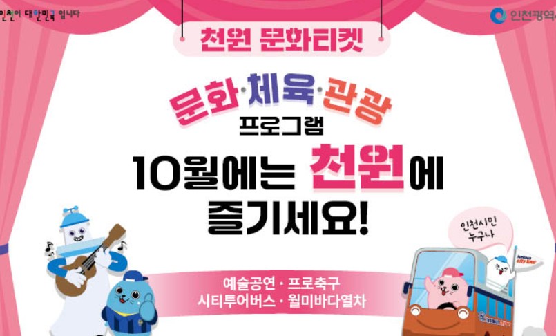 인천시민이라면 주목! 2025년 10월 한 달간 천원으로 즐기는 문화·체육·공연 프로그램이 진행됩니다. 예매 일정 확인 필수![인천시 혜택] 천원의 행복! 2025년 10월 문화·체육·공연 프로그램 총정리🎉 천원의 행복! 인천시 10월 문화·체육·공연 이벤트 열린다인천시가 시민과 청소년을 위해 준비한 특별한 문화 혜택!바로 단돈 1,000원으로 다양한 문화·공연·관광 프로그램을 체험할 수 있는 ‘천원의 행복’ 이벤트입니다.2025년 10월 한 달간 진행되며, 인천 시민과 청소년을 대상으로 총 5,000명 규모로 운영될 예정입니다.💡 공연 예매는 선착순 마감이기 때문에 관심 있는 분들은 빠르게 신청하세요!🗓️ 행사 개요항목내용행사명천원의 행복! 2025년 10월 문화·체육·관광 프로그램운영 기간202..